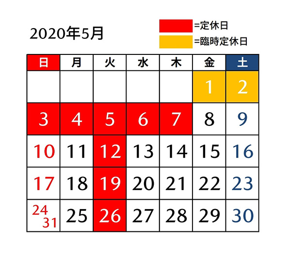 新型コロナウィルス感染拡大防止に向け、緊急事態宣言が全国を対象に発令されたことを受け、お客様と従業員の健康と安全を考慮し、5月の店休日を 1日、2日も追加し下記の日程に変更することといたしました。