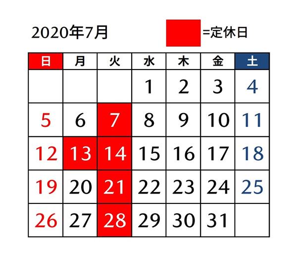 7月は毎週火曜日の他に、13日(月)が店休日となります。