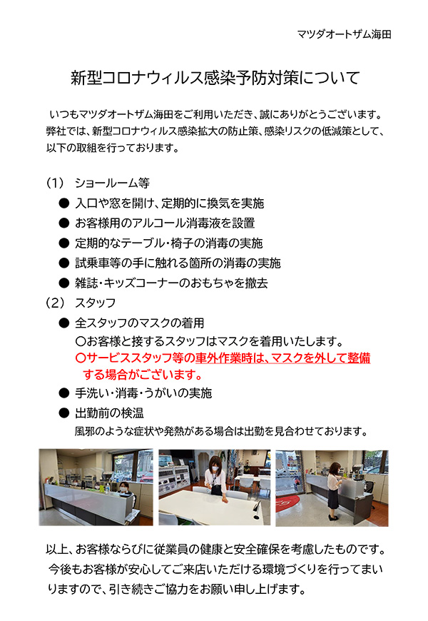 マツダオートザム海田では、新型コロナウィルス感染予防対策の取組として、